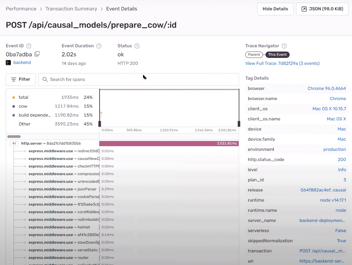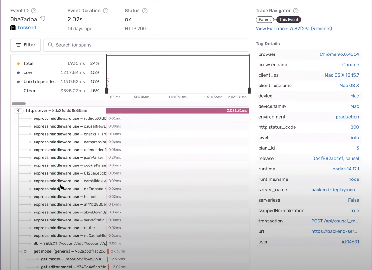 On the backend, Sentry equips Causal with the tools to effectively monitor their middleware, and the Express SDK gives the team useful insight into transactions. Additionally, the ability to customize instrumentation helps the team scale as they build new products and come across unique use cases.