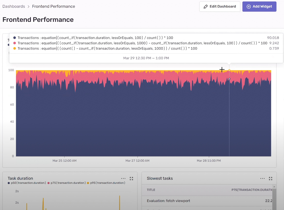On the frontend, the team liked Sentry’s out-of-the-box Redux, Postgres and React instrumentation; and was able to set up a dashboard to monitor all transactions across the frontend to see how they’re performing in real-time.