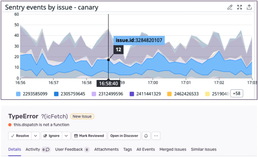 Wherever a ‘bad release’ was at fault, Igor's team found that there was often a corresponding Sentry alert notifying developers of error spikes. Engineers triaging could rely on the details they got from Sentry since nearly all instances of buggy releases were already logged.