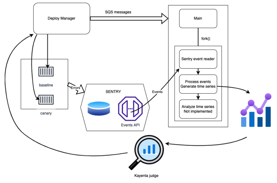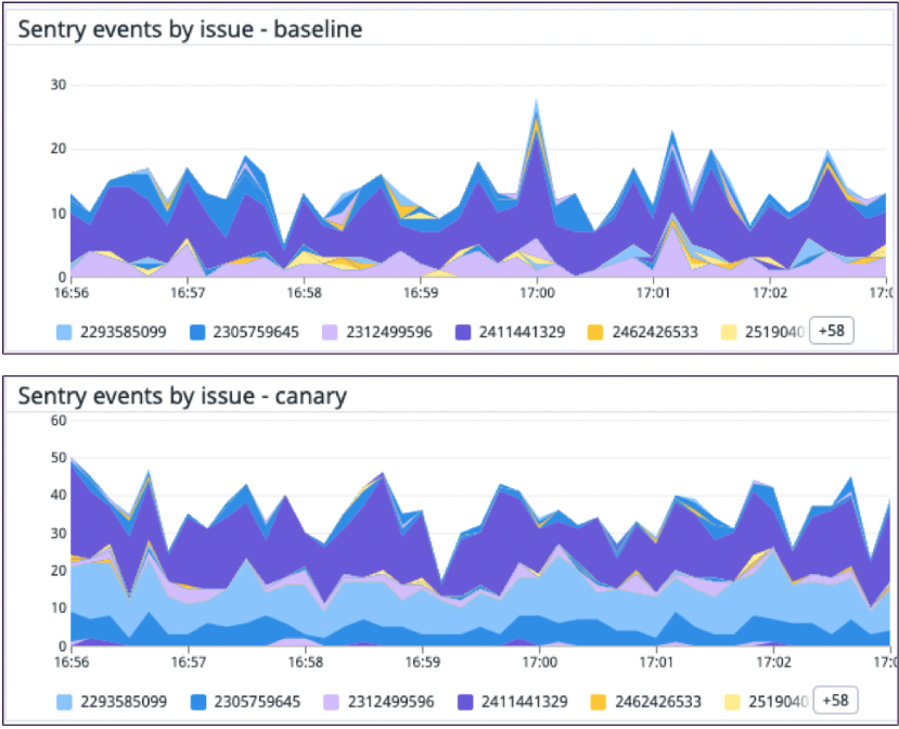 Igor’s team then started looking at Sentry to extract more detailed data to add to the automated analysis. The deploy manager still deploys baseline and canary, but also sends an SQS message to a custom service, which kicks off a new Sentry integration that runs for the test duration. This pulls from Sentry’s V2 API with the service name being tested and reads all the errors that are generated back to it in real-time, before splitting them into what’s coming from baseline and what originated in canary, disregarding everything else.