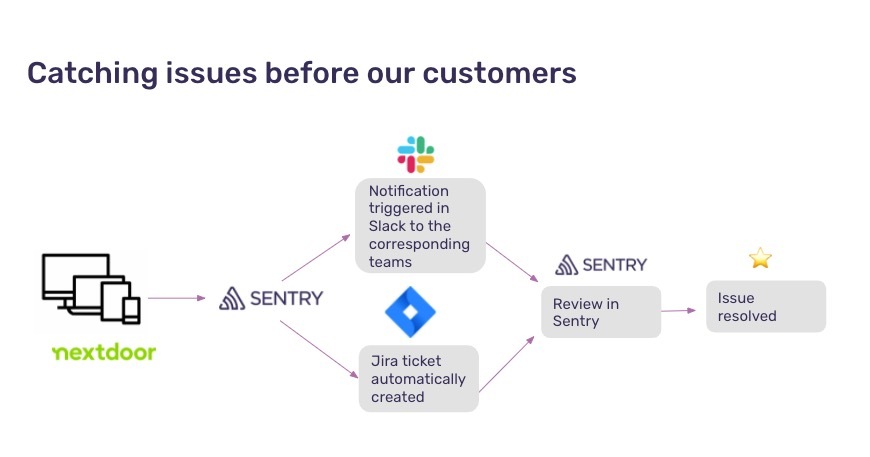 Before using Sentry, Nextdoor relied on their users—reaching out via support and social media—to alert them of issues. With more than 100 engineers shipping software and issues arising daily, the teams were having trouble tracking the sources and owners of the bugs.