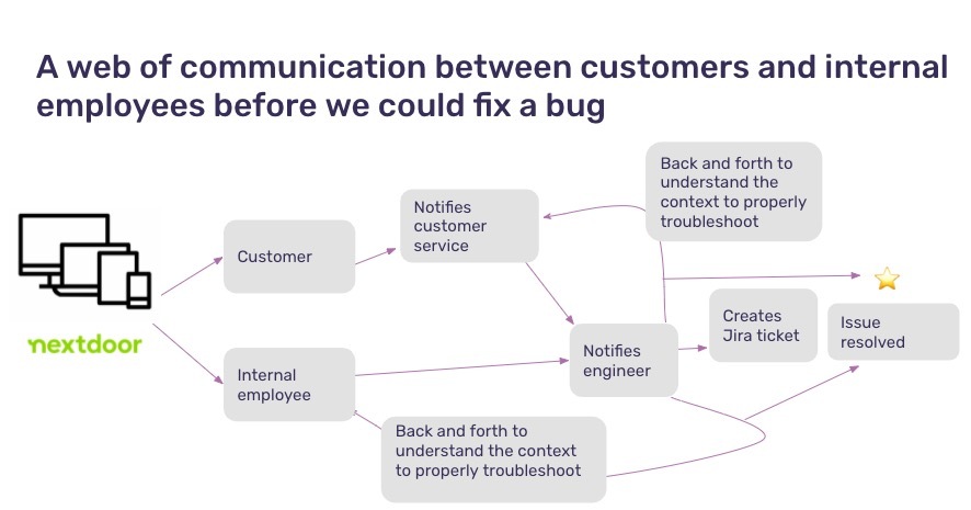 Before, when an issue came up, the process was to (attempt to) reproduce, determine, and triage. However, this chain of actions to resolution was messy and reactive: they’d wait to hear from customers and employees about a problem. From there, the engineering teams would be notified, who would (manually) create a Jira ticket and then begin back and forths to understand the context and properly troubleshoot the problem. Finally, after some lengthy searching, attempting to find the source and the owner, and troubleshooting, the issue would be resolved.