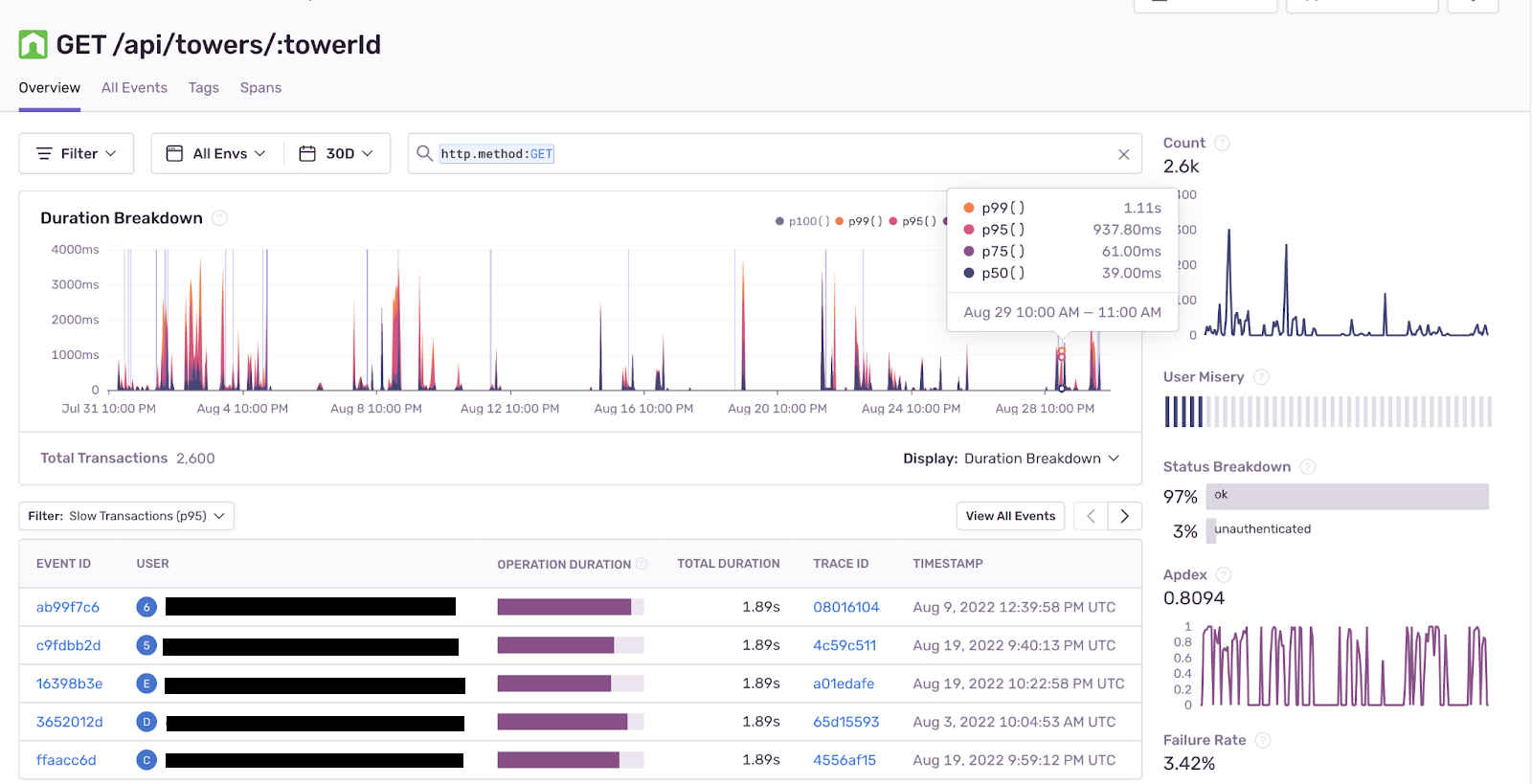 The team also configured alerts based on a set response time threshold for each transaction. Measuring the actual response time a user experienced as well as the number of times the threshold was exceeded, Sentry generates a “user misery” score that helps them prioritize issues based on their impact.