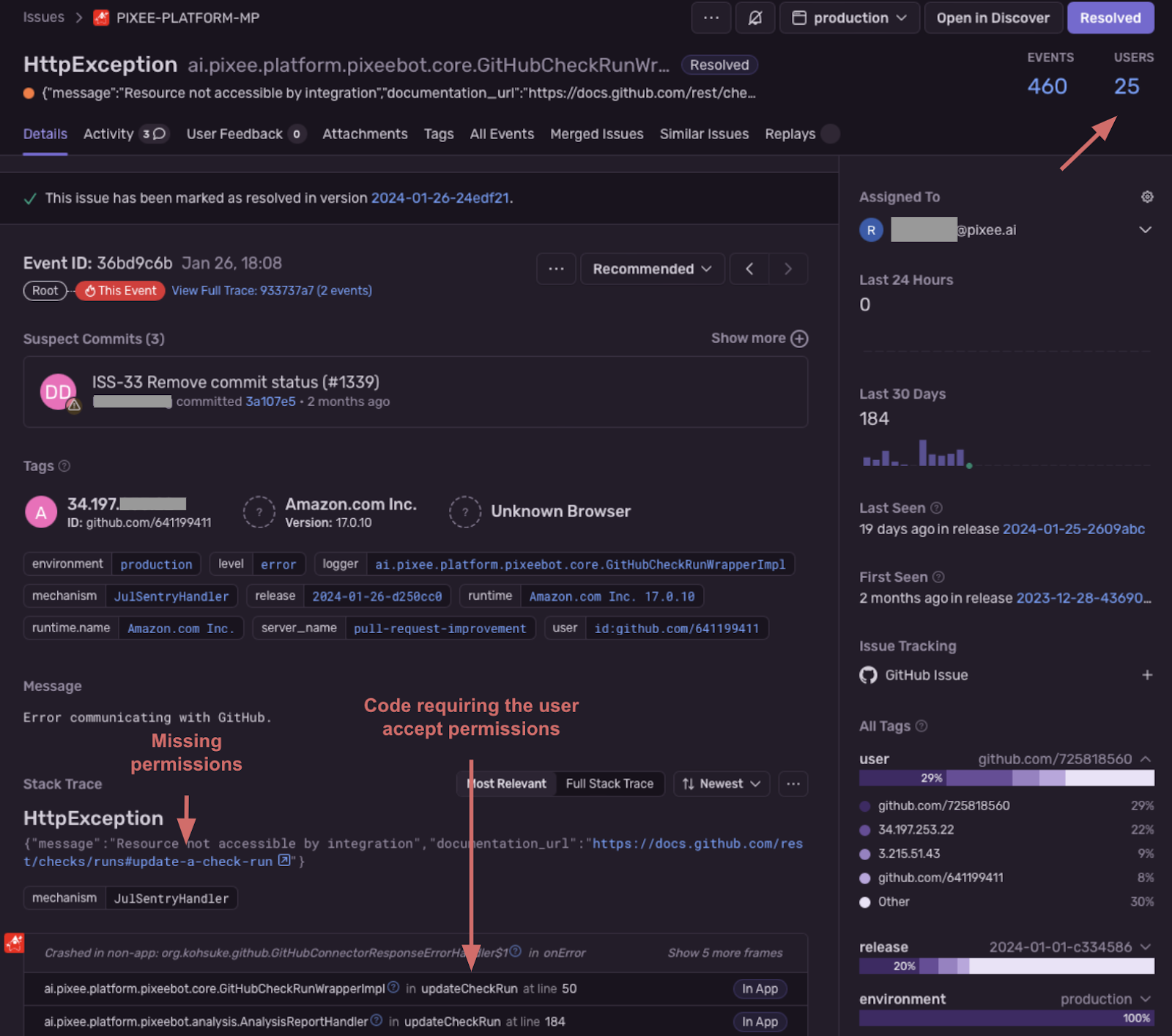 Recently, Pixee released a new feature that required expanding the permissions needed by their GitHub App, which existing users needed to accept new permissions for. With Sentry, the engineering team found a bug related to checking if the user had accepted the permissions before exercising them. By viewing the stack trace in Sentry, the team could see which class was missing the permissions check. By looking at the user information on the issue details page, they could see which and how many users the bug was affecting. If it were a few users, they could reach out directly to the customers to accept the new permissions and not push a code change. However, in this case it was affecting a few dozen users, so they made the business decision to push a code change.