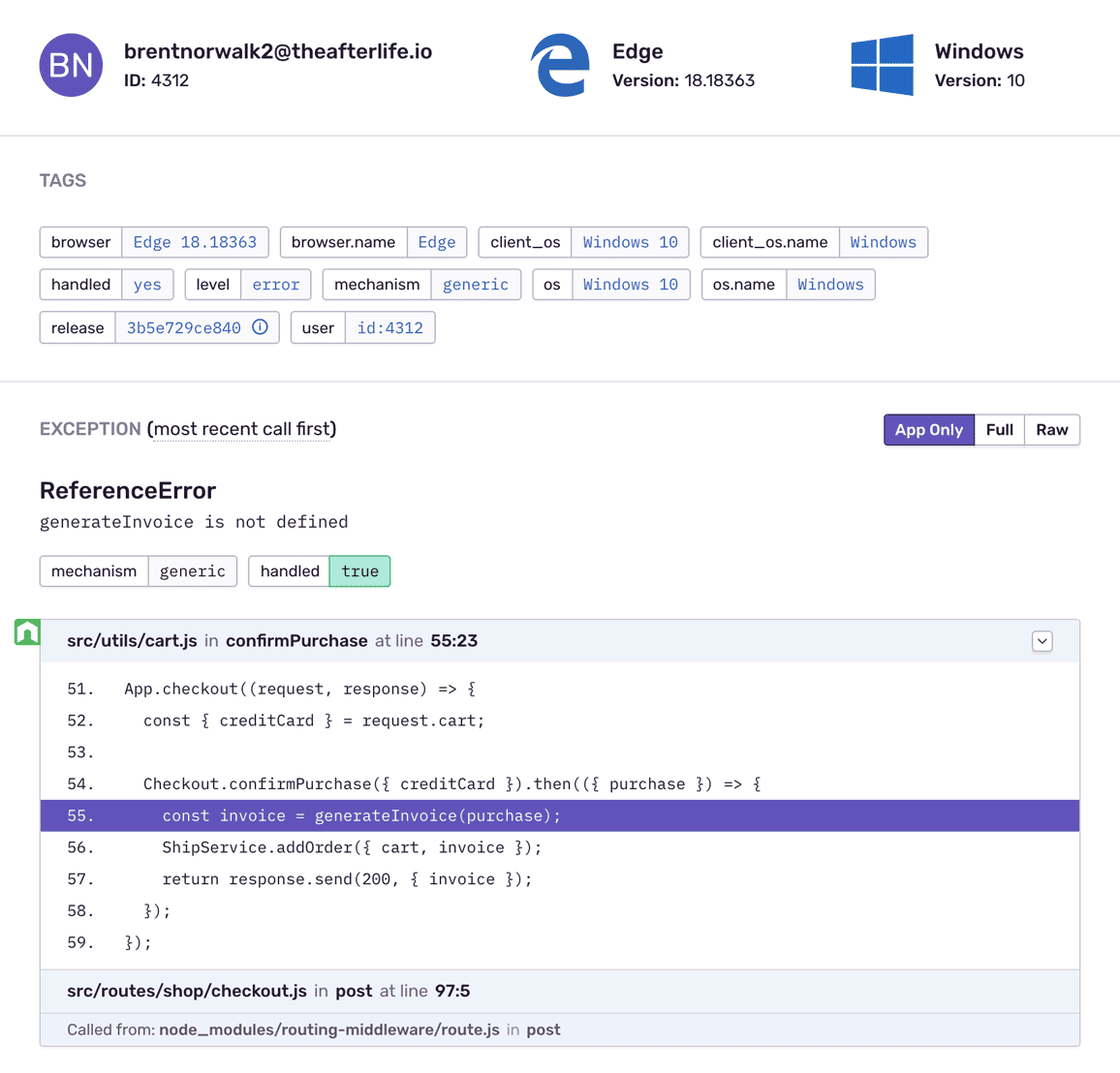 Aggregate errors by factors like request details, user ID, and event level to see what's new, a priority, or a trend.