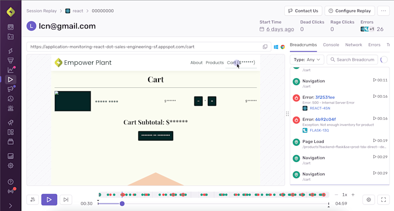 Get to the root cause of an issue faster by watching replays of real user sessions with best-in-class privacy controls. Understand when, where, and how an error is impacting your website or mobile app without having to repro it yourself, talk to a customer, or expose sensitive data.