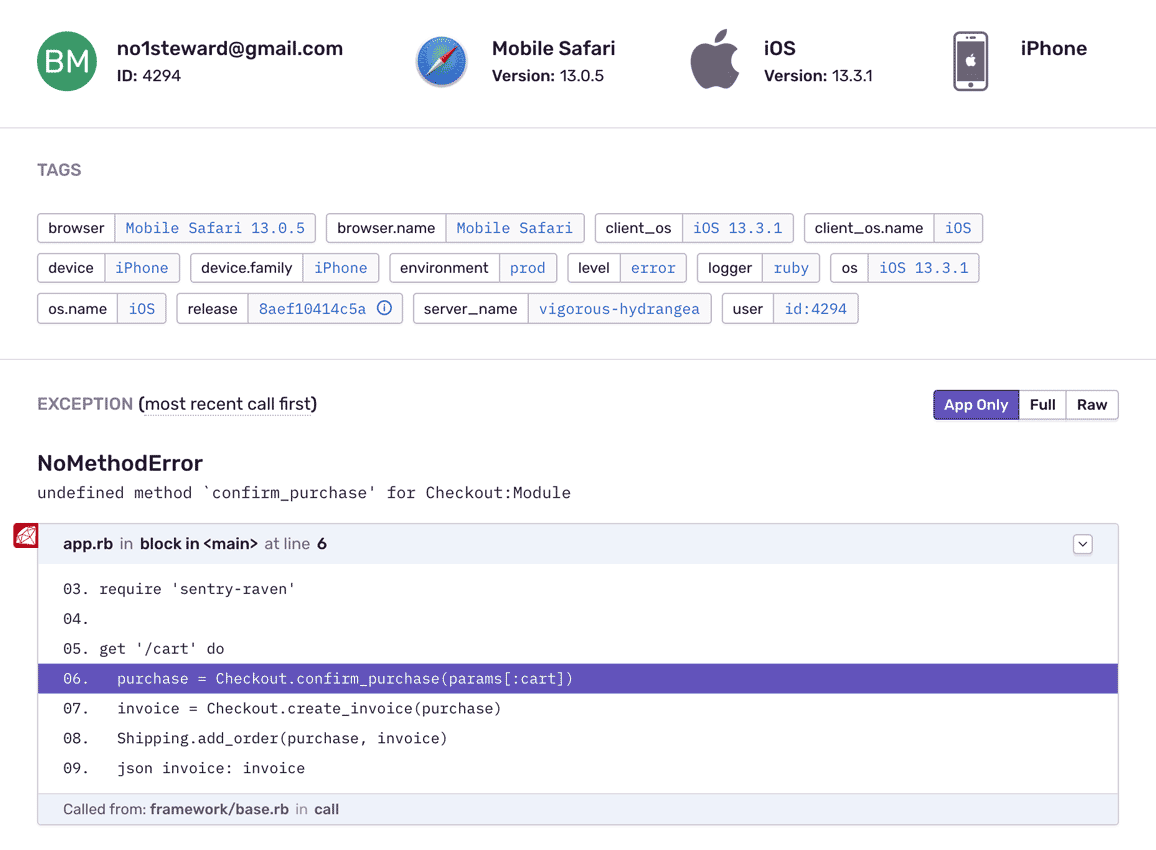 Actionable insights to resolve Sinatra performance bottlenecks and errors. Improve your Sinatra monitoring workflow with a full view of releases so you can mark errors as resolved and prioritize live issues.