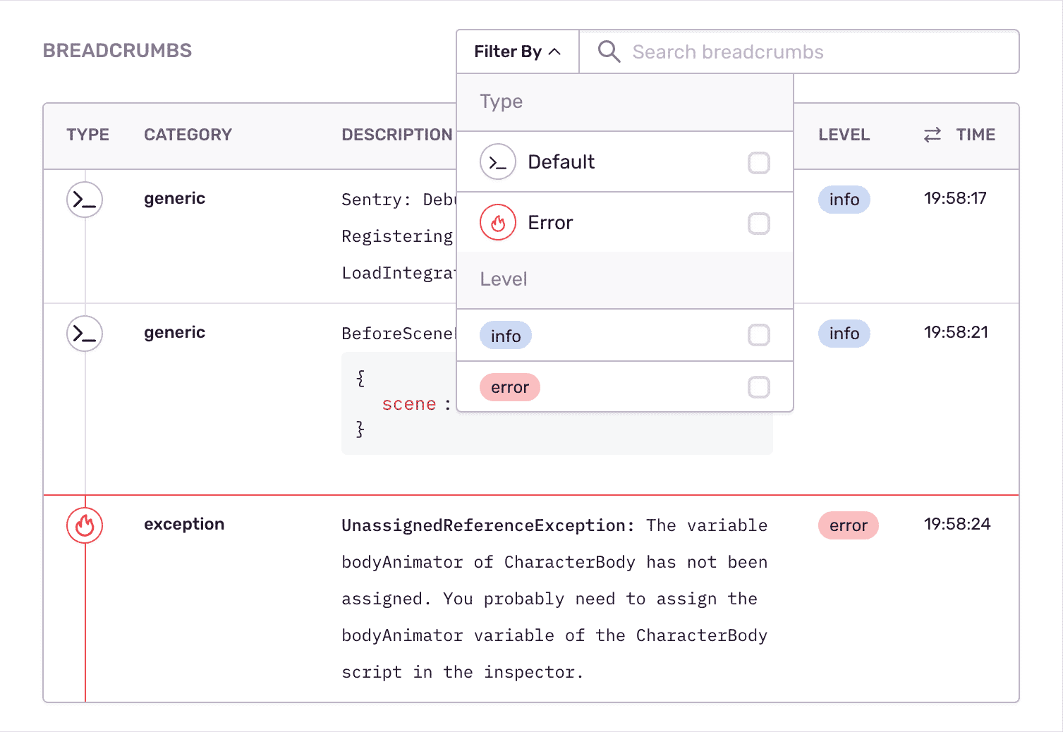 See Unity stack trace details like filename and line number so you never have to guess. Filter and group Unity exceptions intuitively to eliminate noise. Monitor errors at scale without impacting throughput in production.