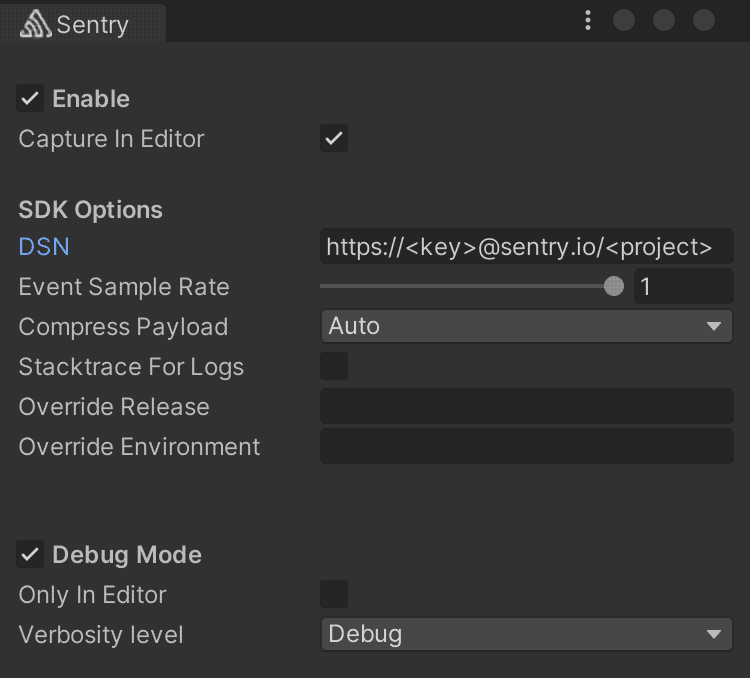 Sentry can be configured via the Sentry configuration window or programatically. The window can be accessed by going to Unity's top menu: Tools > Sentry.