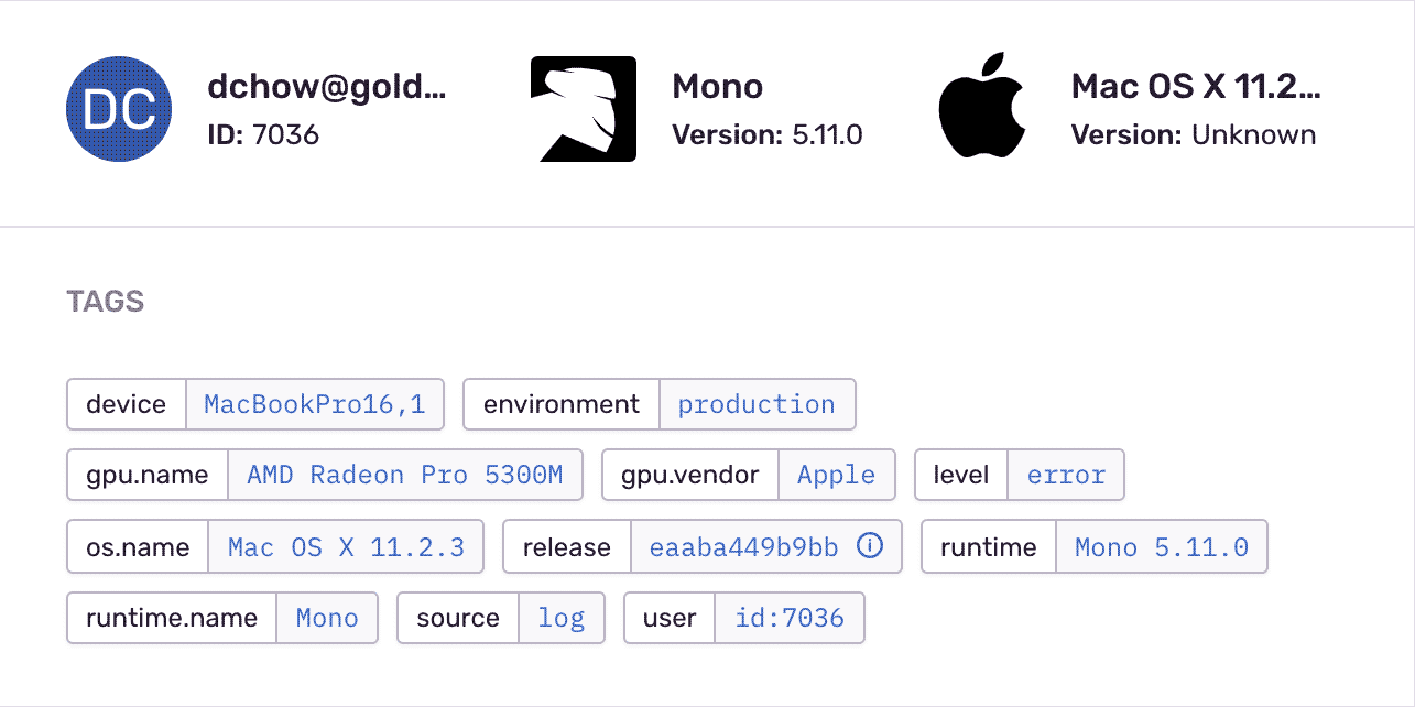 With Sentry's exceptional exception handling in Unity, you can triage quickly based on specific parameters like HTTP request, workflow stage, and hostname for each issue. Set custom tags to recreate the error environment relevant to your app, business concerns, and users.