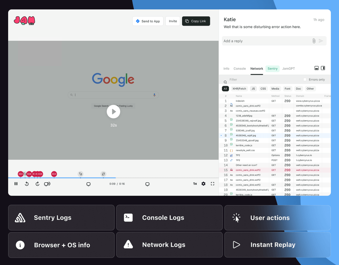 The Jam link auto-includes all the front-end errors from the browser, including diagnostics from the console logs, network requests, device information, and more.