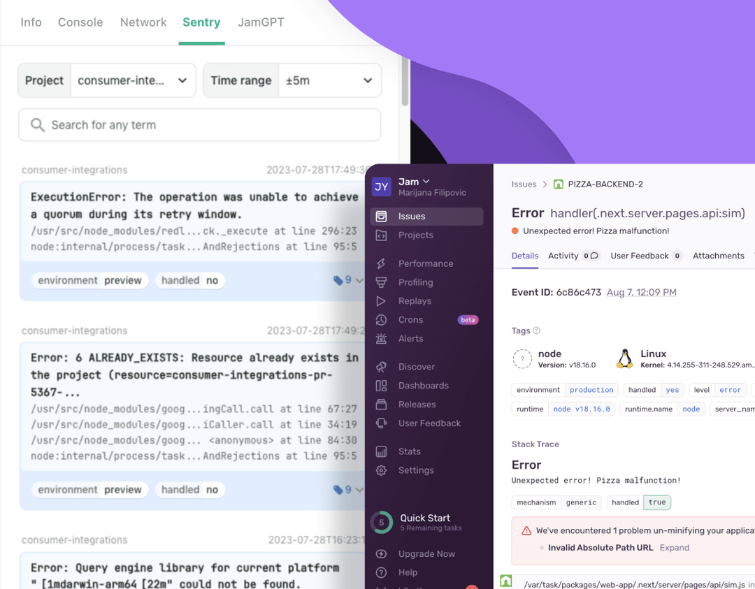 Pull Sentry logs directly into your Jam so you have visibility of a bug from the frontend to all the services across your infrastructure that the bug traces within Sentry. Drop the link wherever you and your team collaborate.