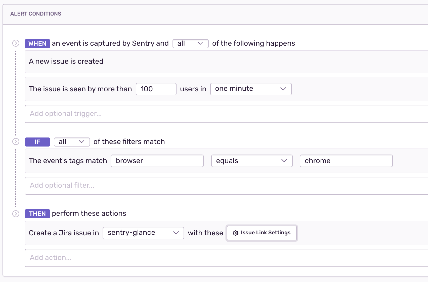 Define Issue Alerts based on issue impact, tags, or several other conditions and automatically create Jira tickets in the project and backlog of the team that can fix the problem.