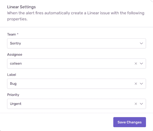 Define Issue Alerts and Metric Alerts based on issue impact, latency, or other conditions. Automatically create a Linear issue when an alert is triggered to get the problem reviewed and prioritized by the right team.