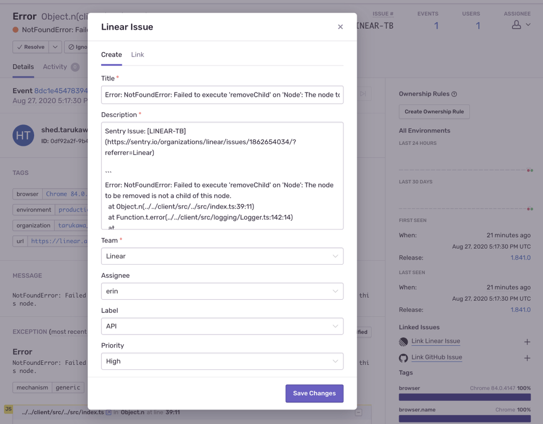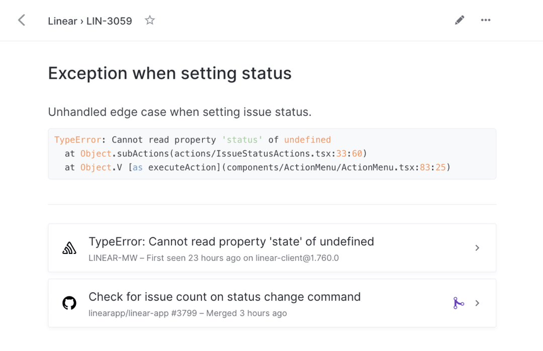 Create a Linear issue from any Sentry error. Assign it to a team or teammate, add a label and set the priority directly from Sentry. Close the issue in Linear and it'll resolve in Sentry as well.