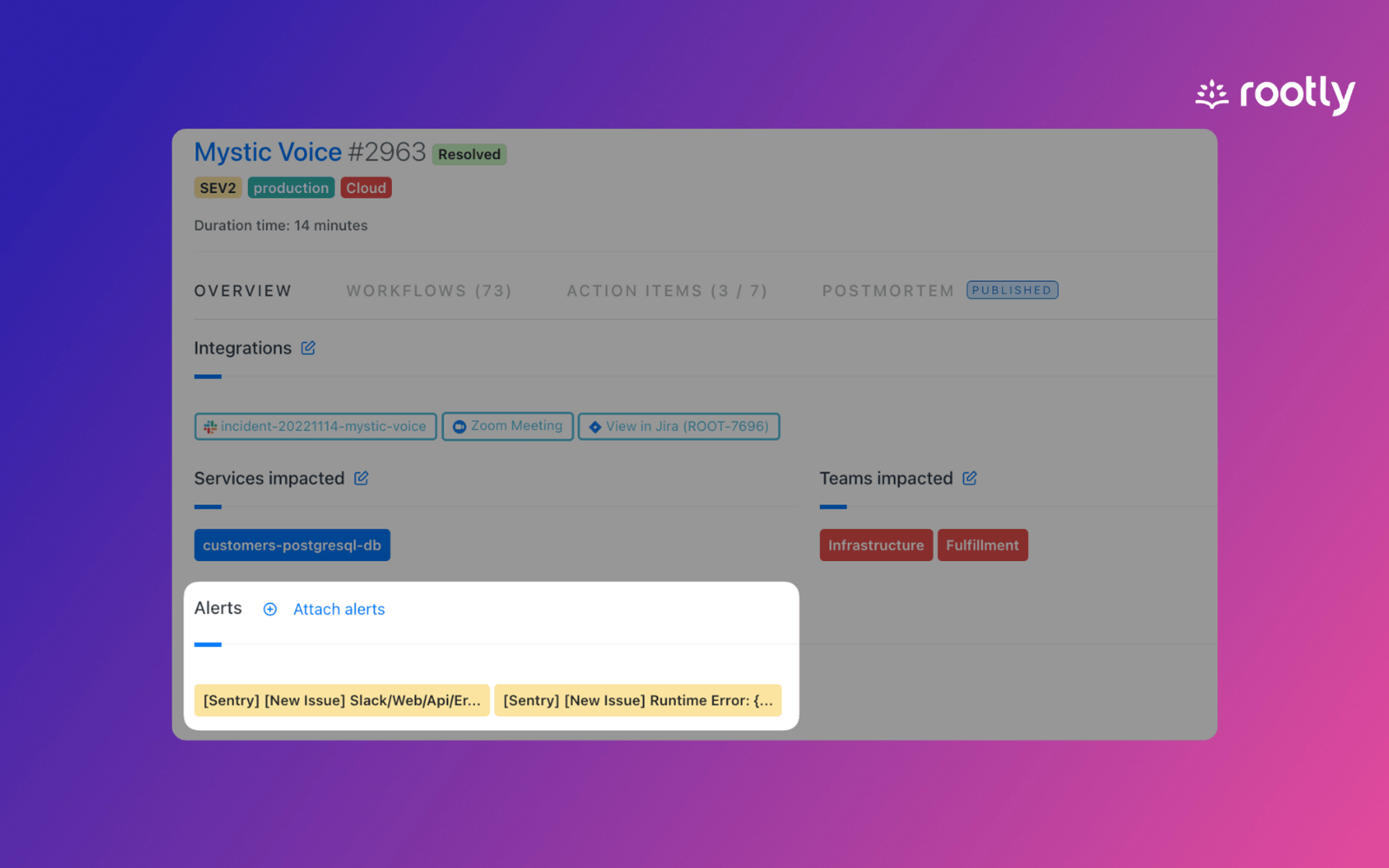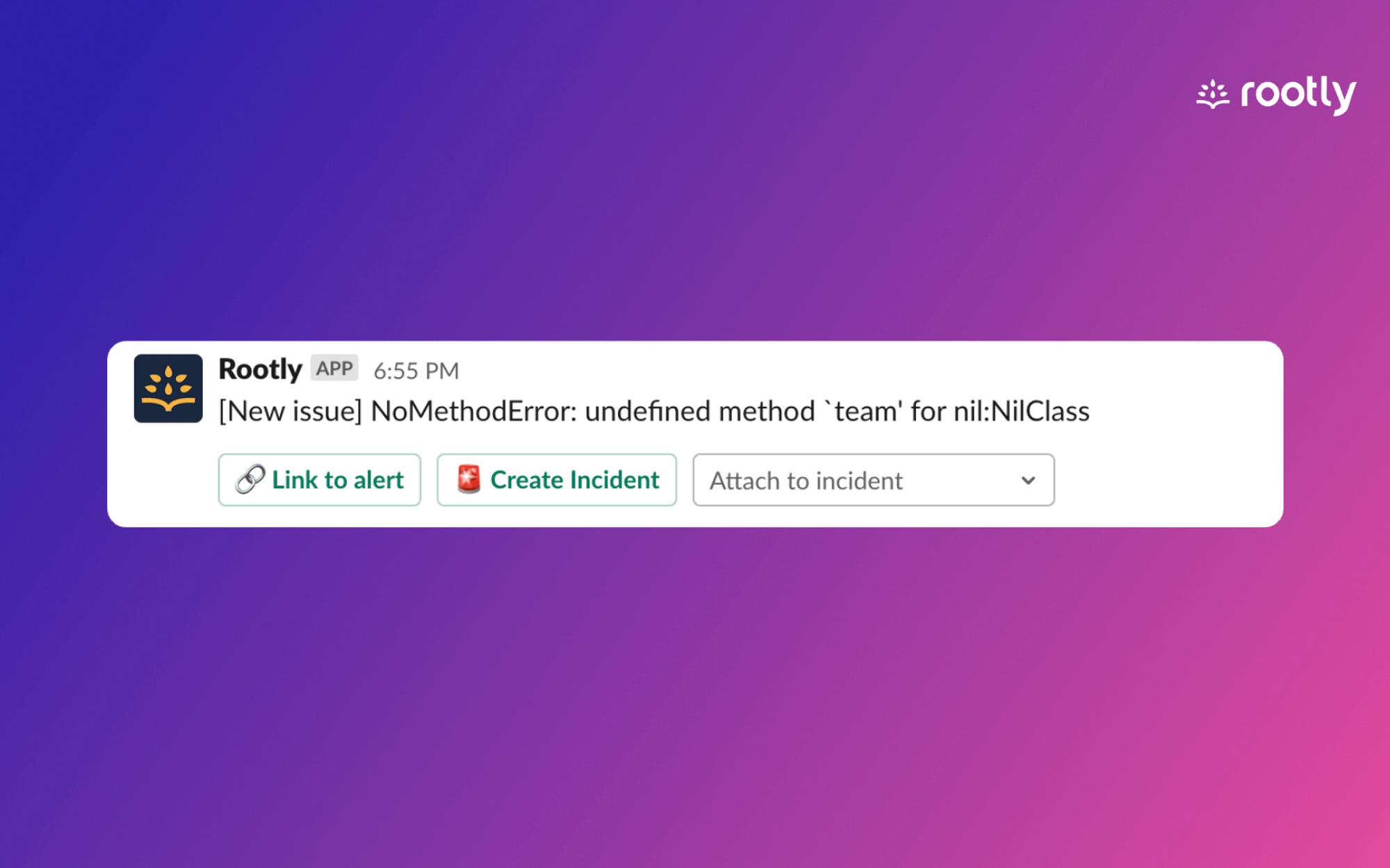 Sentry alerts are piped into Rootly. Then from Slack or Web, incidents can be created automatically or manually from Sentry alerts.