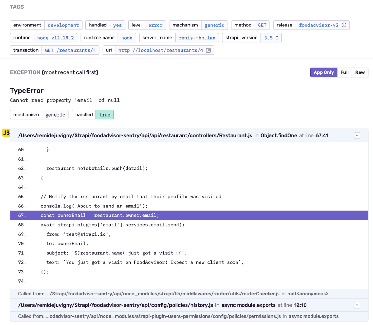 The plugin will help you to log errors in your Strapi app and get context to identify the source of the problem. It will identify the previous events that led to an error, and what commit introduced the bug. Once installed, the plugin will send errors encountered in your application's end API to Sentry, attach useful metadata to Sentry events to help you with debugging.