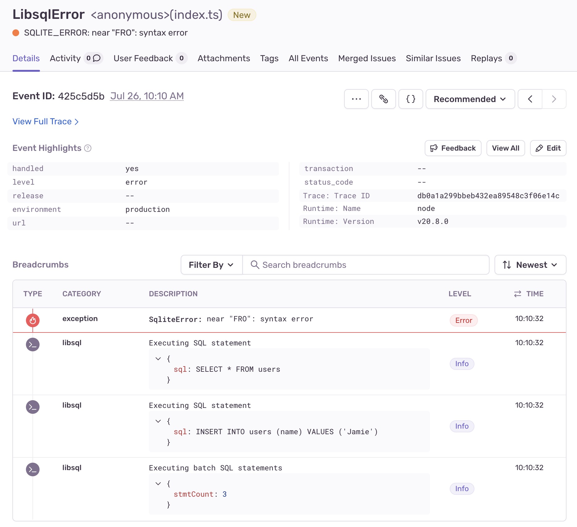Detect invalid SQL statements by capturing errors made by your application to your SQLite database using the libSQL client, including any invalid arguments.