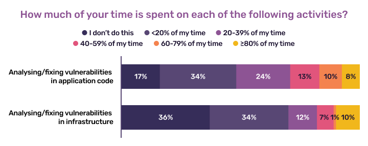 SRE/DevOps specialists are more likely to spend time fixing application code than vulnerabilities in infrastructure – nearly 3 in 10 spend 40%+ of their time fixing application issues, compared to nearly 2 in 10 who spend 40%+ of their time on infrastructure.