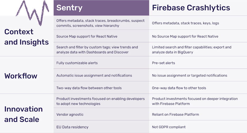Firebase Crashlytics may suit the needs of hobbyists, solopreneurs, and small teams. Sentry, on the other hand, is a better solution for growing teams that need deeper context and insights into solving crashes and errors, customizable workflow tools, and product investments to enable innovation and scale.